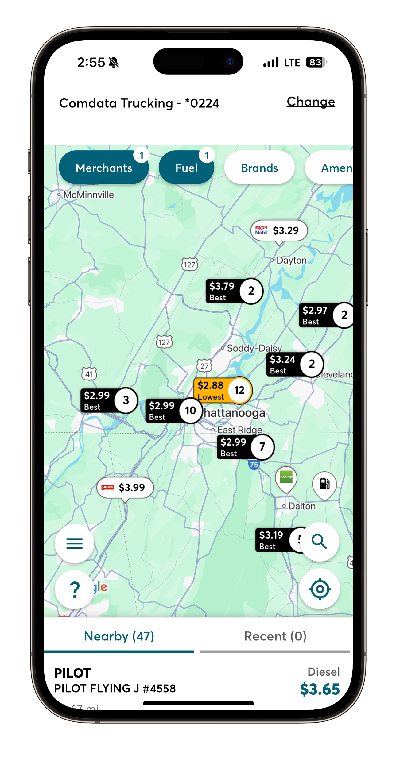1 Daily discounts per site are shown in the Comdata Fuel Locator in the Mobile App. Fleets over 20 Trucks (as determined at the time of application) are not eligible for advertised discounts, but attractive custom discount offers are available from Comdata sales representatives. Discounts for each fleet must be approved by truck stop chains. To be eligible for discount program, invoice must be paid in full and on time. Discounts are subject to change beginning twelve months after account setup.